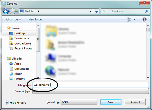 - Jika sudah, Kemudian simpan dengan Nama welcome.vbs
